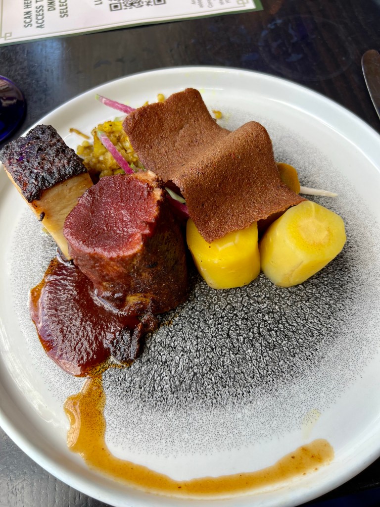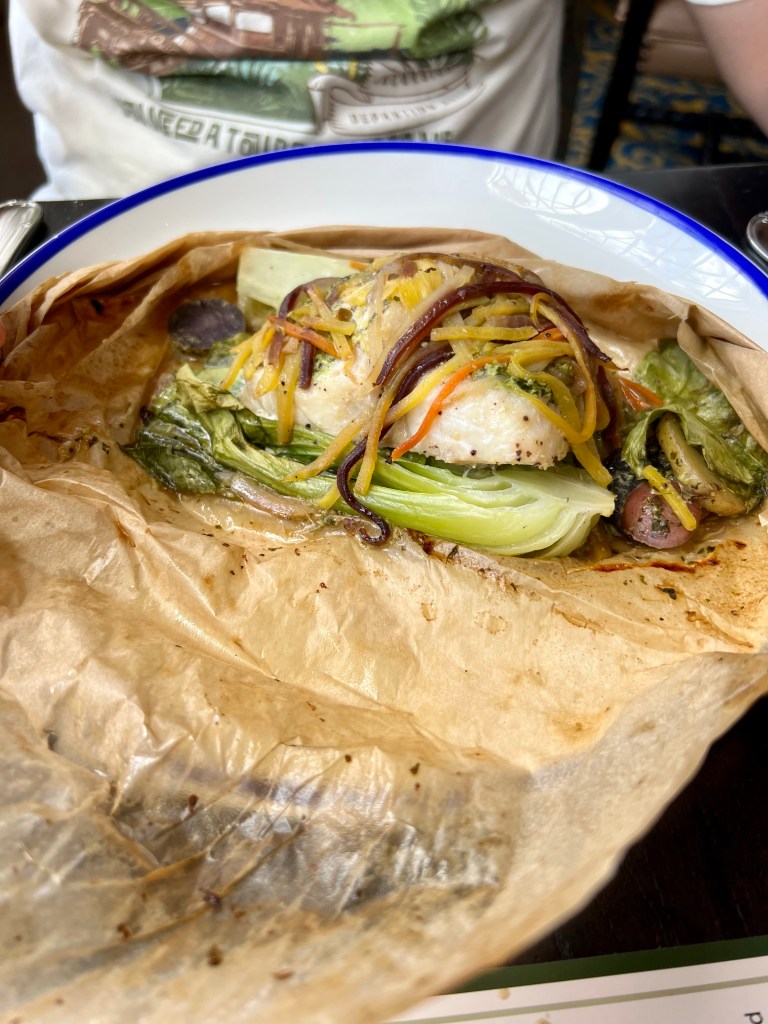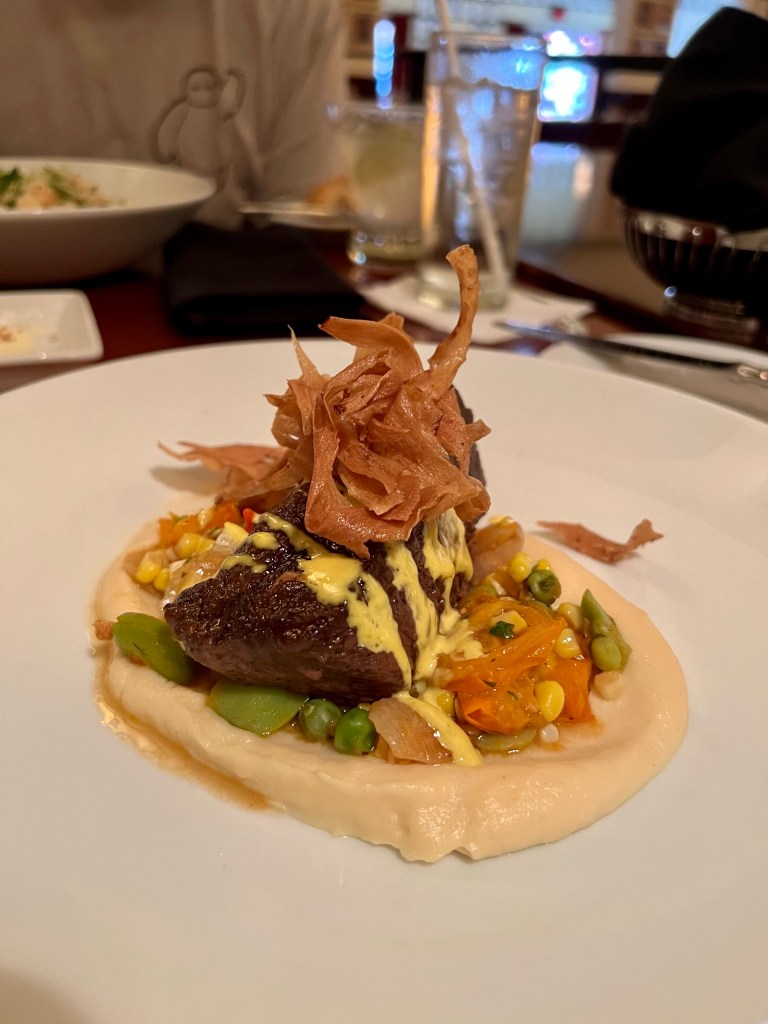For entrees, I picked the Magic Carpet Ride (Spiced-crusted Pork Tenderloin and Pork Belly with Curry Couscous, Glazed Rainbow Carrots, and a Peppercorn Flying Carpet). It was absolutely delicious! I loved the Middle-Eastern flavors and spices and could’ve eaten buckets of that couscous. John ordered the Sustainable Catch En Papillote (Marbled Potatoes, Chimichurri, and Seasonal Vegetables) and really liked the flavors.