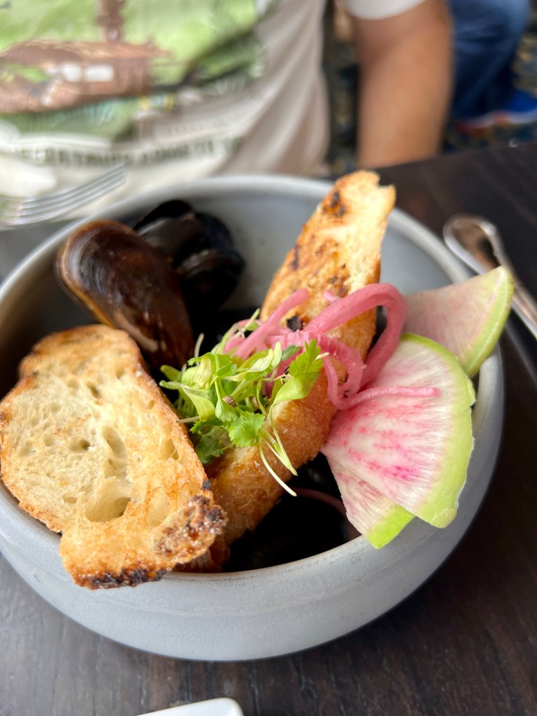 Here, you get to choose an appetizer, an entree, and a dessert for $62 ($37 for kids). For appetizers, I ordered the Castle Salad (Romaine, Brussels Sprouts, Citrus, and Fennel with a Passion Fruit Vinaigrette) and John ordered the Steamed Mussels (Prince Edward Island Mussels, White Wine-Coconut Curry, Tomatoes and Cilantro served with Garlic Toast). The salad was light and refreshing (and I’m sure my body was like, yay green stuff! amidst all the sweets and treats). John enjoyed the mussels because they’re something he wouldn’t normally have.