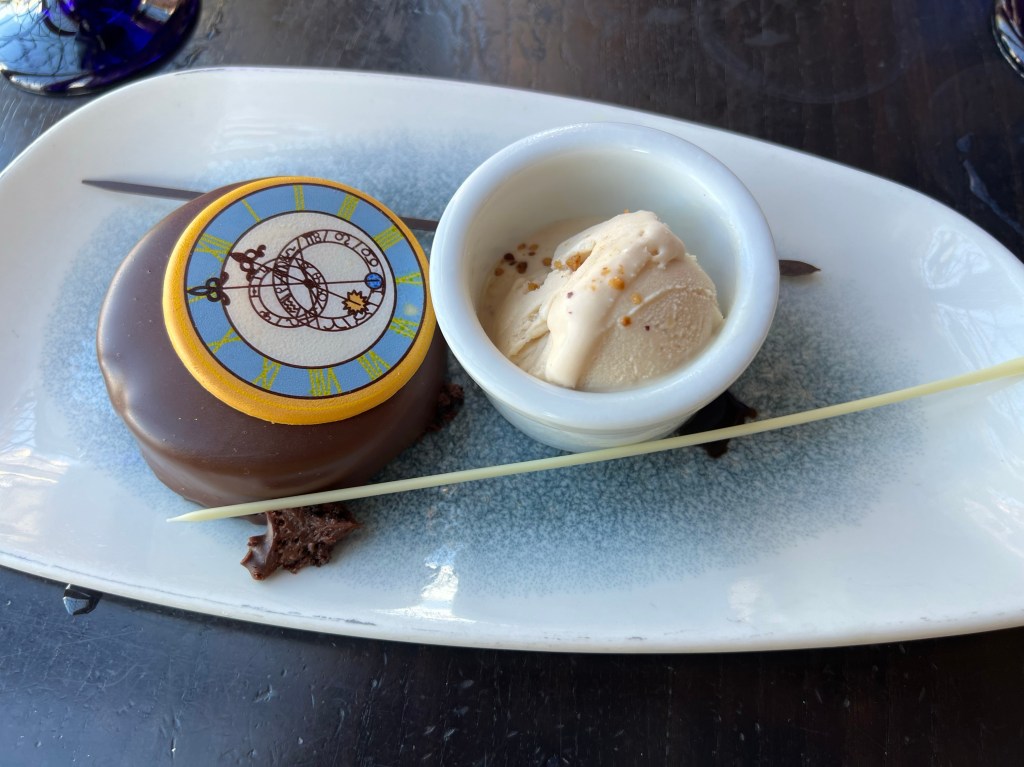 For dessert, I ordered The Clock Strikes Twelve (Dark Chocolate Mousse with a Caramel and Crunchy Praline Center, served with Chocolate Sauce and Hazelnut Gelato). I’m not usually wild about mousse desserts, but this was so good, especially the hazelnut gelato! I have a massive sweet tooth, so this dessert hit the spot. John ordered the Jaq and Gus (Cheesecake with Seasonal Flavors and Garnishes). The cheesecake was good but was pretty basic.