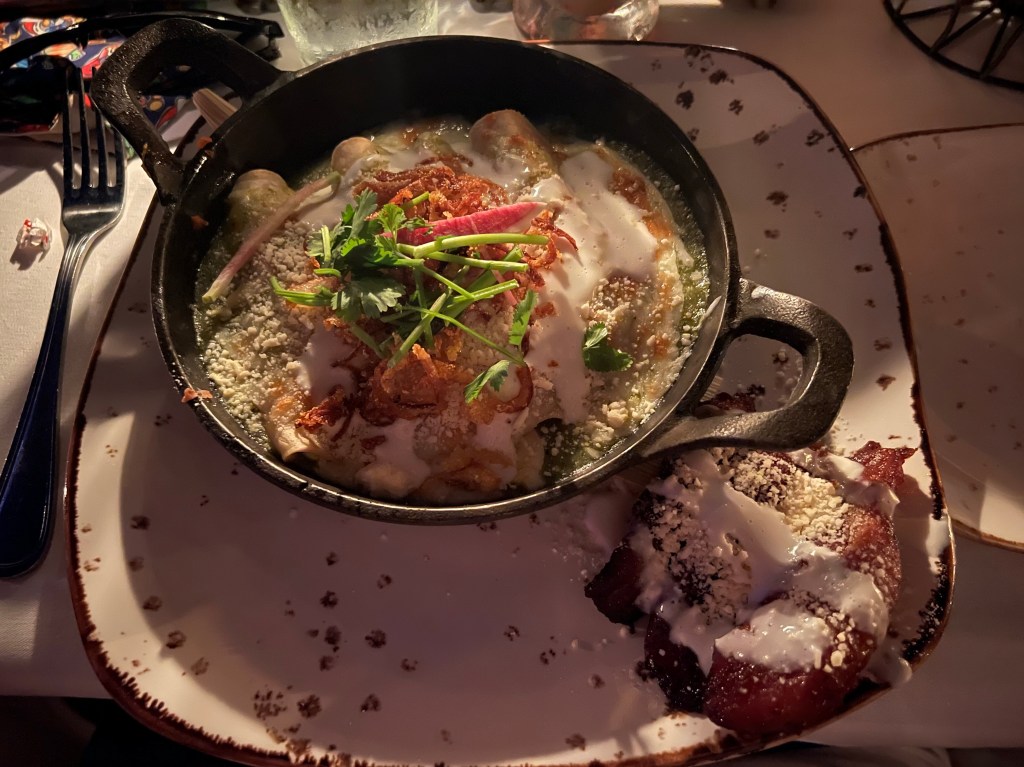 For entrees, I got the Enchiladas de Pollo (Corn Tortillas filled with Chipotle Chicken covered with Salsa Verde, Crema Mexicana, Cotija Cheese and Crispy Onion Straws atop Refried Beans served with Plantains topped with Crema Mexicana and Cotija Cheese). They arrived in a skillet and were SO GOOD! I could eat those plantains every single day of my life.