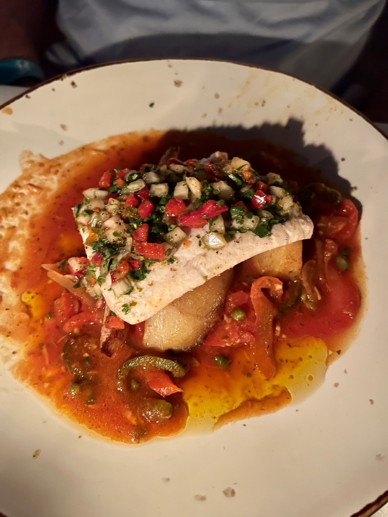 John must’ve been on a fish kick because he got the Pescado a La Veracruzana (Seared snapper atop potatoes with a cilantro-lime vinaigrette made with capers, olives, bell peppers, Spanish onions and tomatoes). He thought it was just ok
