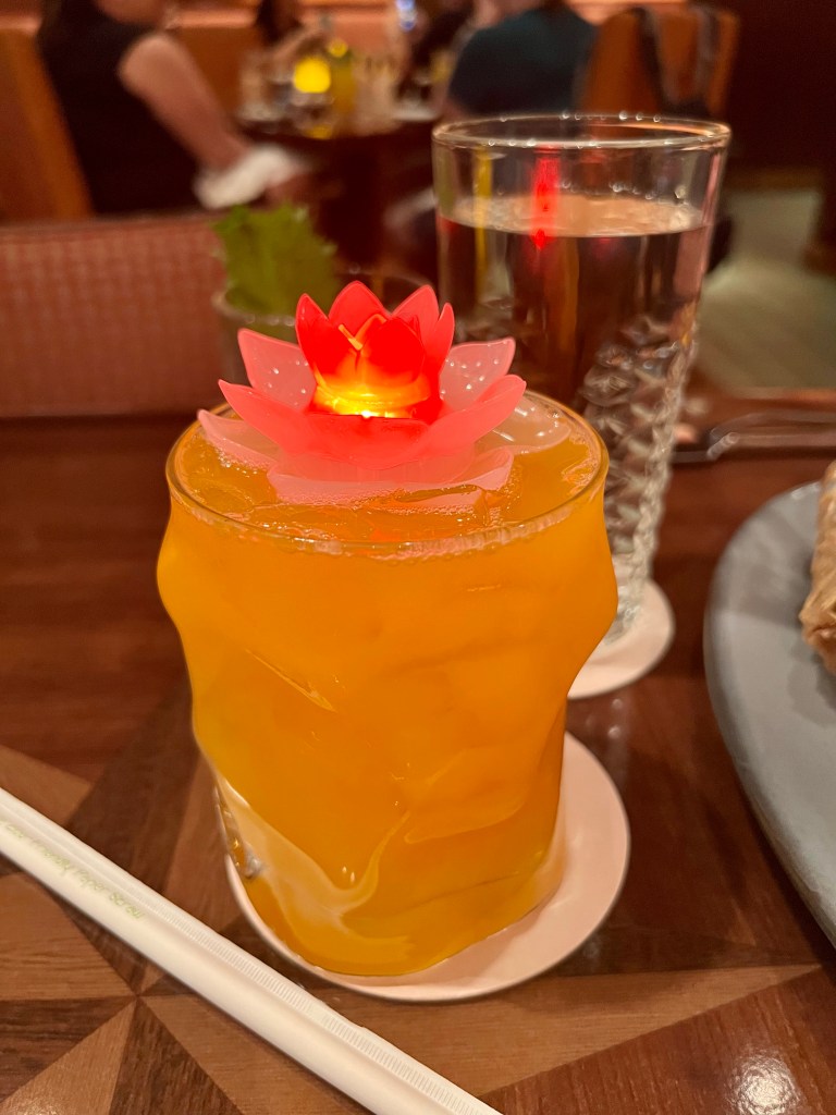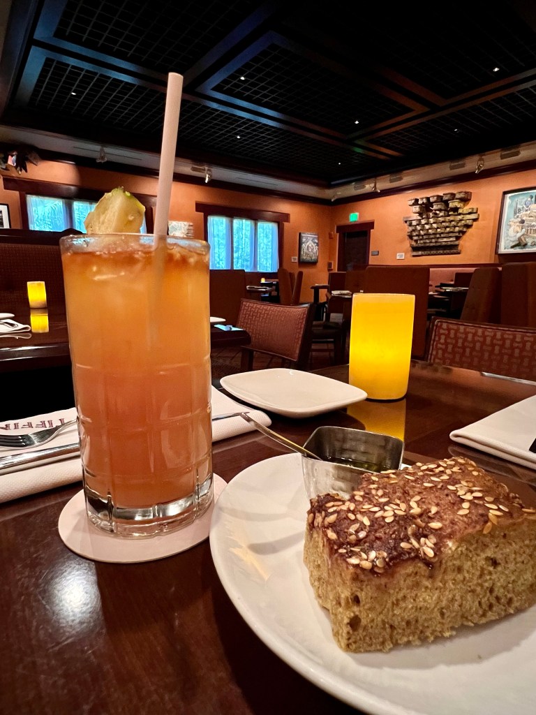 For beverages, I ordered the Lamu Libation (Starr African Rum, Cruzan Banana Rum, and Guava Purée with Orange, Lime, and Pineapple Juices topped with Gosling’s 151 Rum) and John got two drinks throughout the meal. I can’t remember his first choice, but his second was the Annapurna Zing (Bombay Sapphire Gin, Passion Fruit Purée, Mint, Simple Syrup, and Lime Juice topped with Ginger Beer and a glowing Lotus Flower).