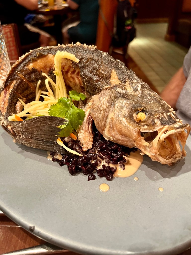 John got the very scary-looking Whole-Fried Sustainable Fish (Coconut Fried Rice, Green and Red Curry, Thai Green Papaya Slaw, Peanuts). It was good, but I don’t care for my food looking back at me. John, on the other hand, said it was his favorite meal of the trip!