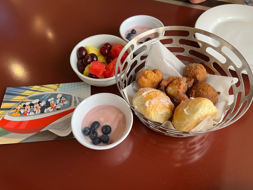 We had a nice spot next to the window with a view of Magic Kingdom. This is currently family-style (which I prefer so much over a buffet). Our waitress brought out yogurt, fruit, and a basket of breads.