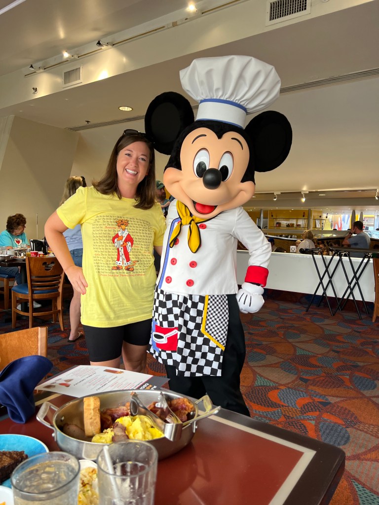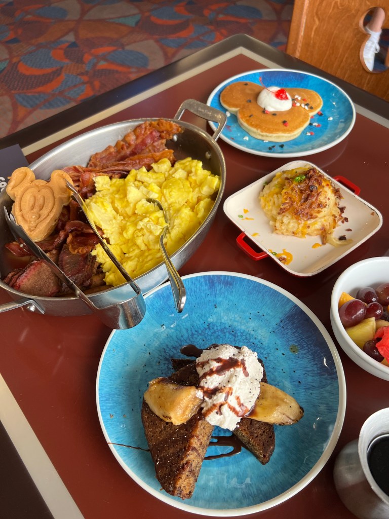 Then she brought a heaping serving of eggs, Mickey waffles, bacon, pork and chicken sausage, and brisket, a Mickey pancake, “loaded” potato cheese casserole, and banana bread French toast.