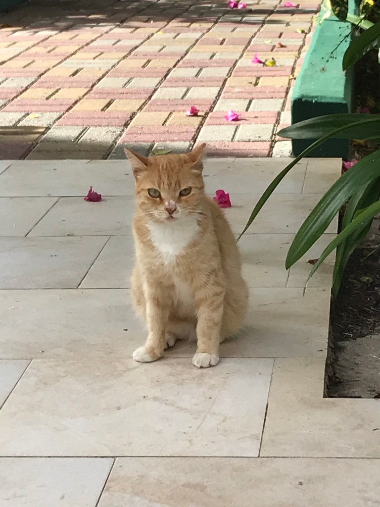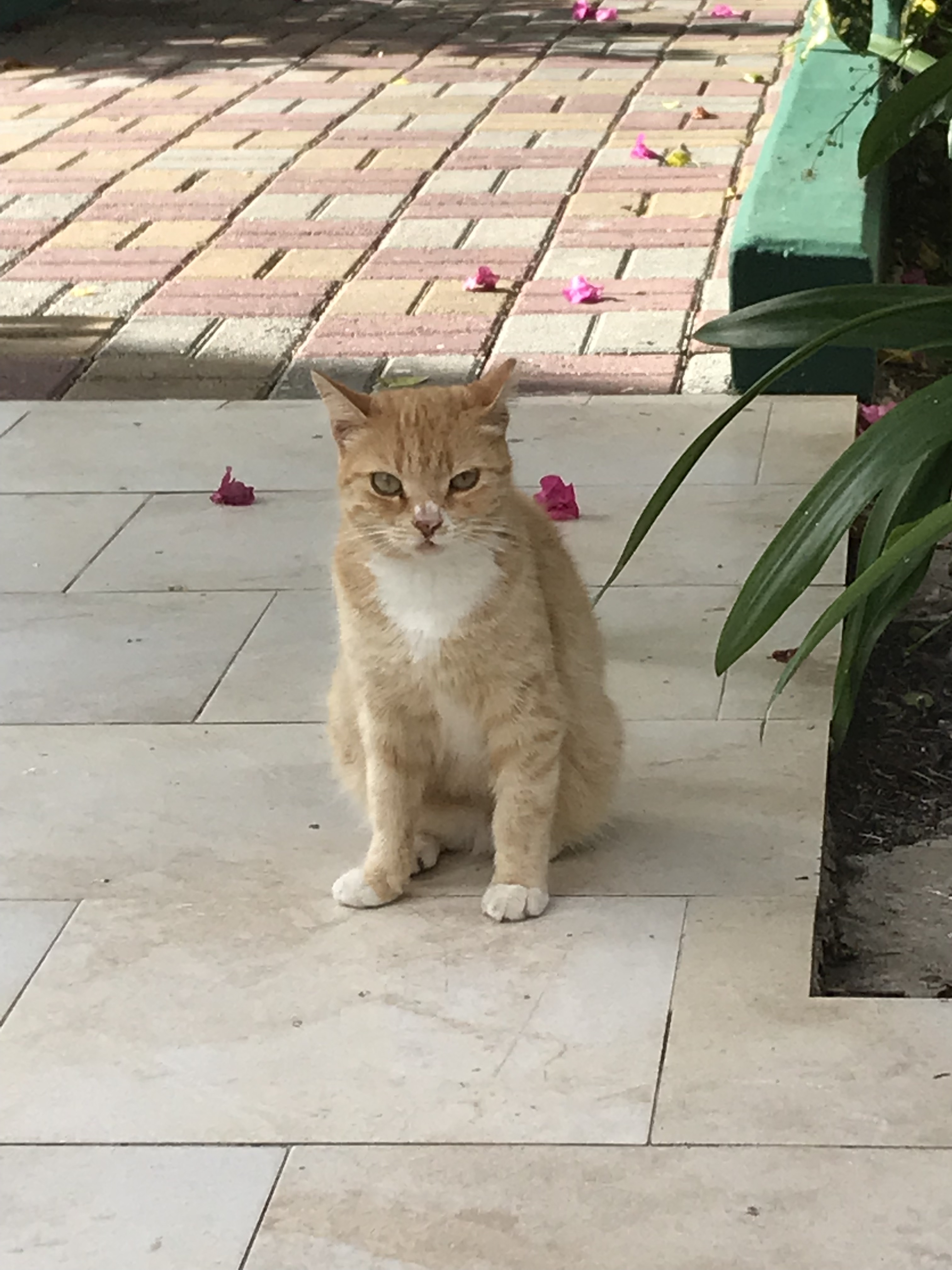 Above is the walkway to our section of rooms. To the left were some tennis courts, the spa, and a workout room. It was always nice and quiet through here! Below, you can see one of the many cats at the resort. I loved how angry this guy looked! There are so many cats wandering around — one day when we had our patio door open, a cat just casually strolled in!